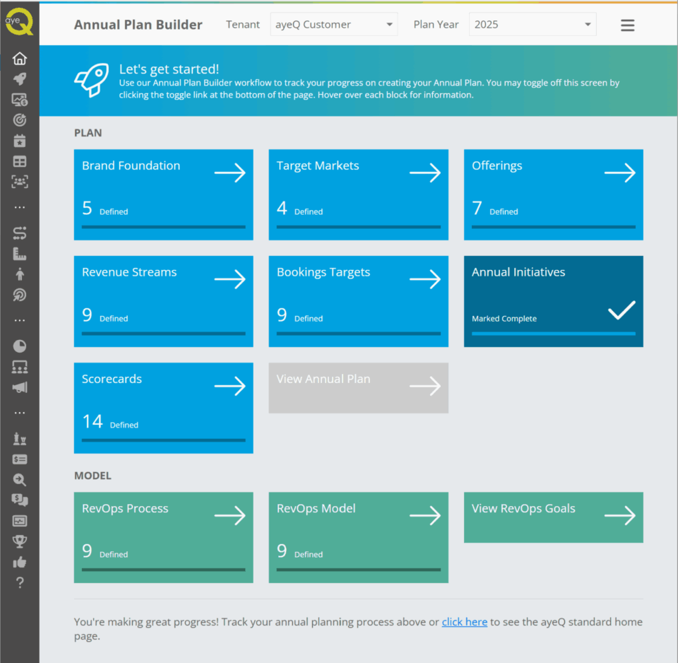 The Annual Plan Builder is ayeQ’s guided workflow that transforms your company data into a validated, board-ready Go-to-Market plan. In less than two weeks, you’ll know exactly what it takes to hit your growth targets — with clarity you’ll never get from spreadsheets.