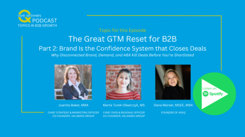 This episode is Part 2 of The Great GTM Reset for B2B, a three-part series based on a recent webinar featuring Dana Marxer (ayeQ) alongside Juanita Baker and Marta Turek from Valmaris Group. In this conversation we unpack why brand is no longer a communications function — but a confidence system that determines whether buyers feel safe enough to move forward.
